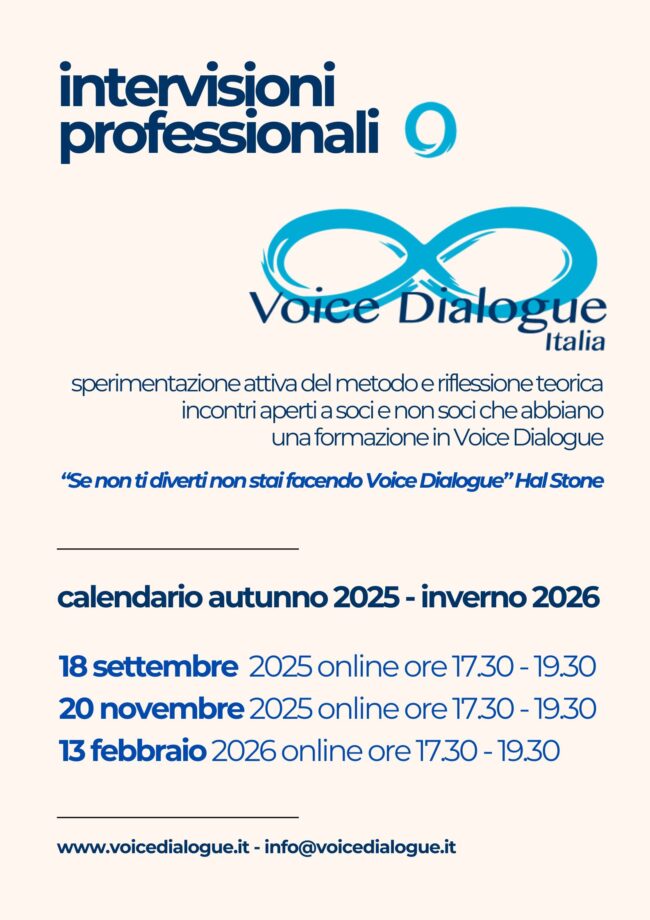 In questi incontri tra pari vogliamo lasciarci ispirare dalla creativita’ nello sperimentare e dal piacere di praticare il Voice Dialogue: “Se non ti diverti non stai facendo Voice Dialogue” diceva Hal Stone! I temi e le modalità di svolgimento si evolvono da un incontro all’altro a seconda di quanto emerge, delle esigenze di chi di…